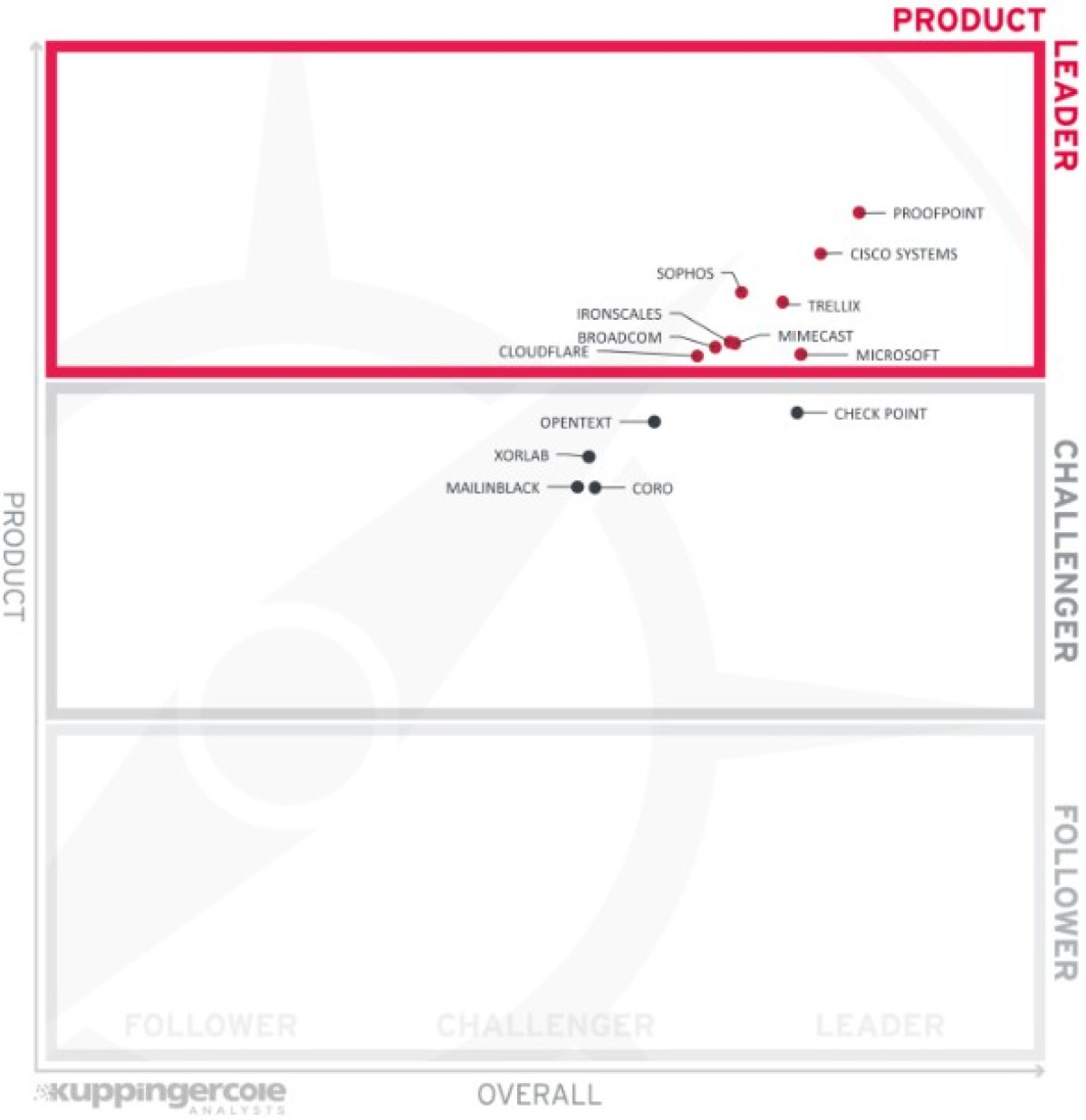 Podjetje Sophos je v poročilu KuppingerCole Analysts AG 2025 Leadership Compass za področje e-poštne varnosti prepoznan kot vodilni v vseh štirih kategorijah: »Overall«, »Product«, »Innovation« in »Market«. Ta dosežek predstavlja izjemen napredek v primerjavi z letom 2023 in utrjuje Sophosov položaj na trgu.